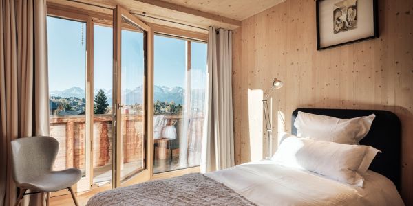 • Grande baie vitrée et terrasse avec fauteuils et vue sur les Alpes